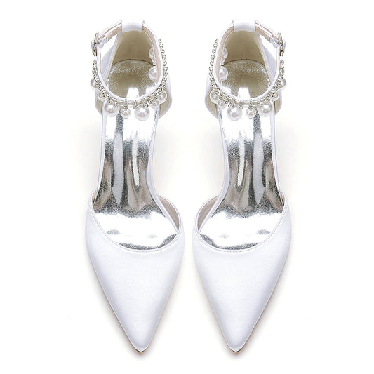 Women's Silk Satin With Ankle Strap Pearl Tassel Closed Toe Stiletto Heel Party Shoes