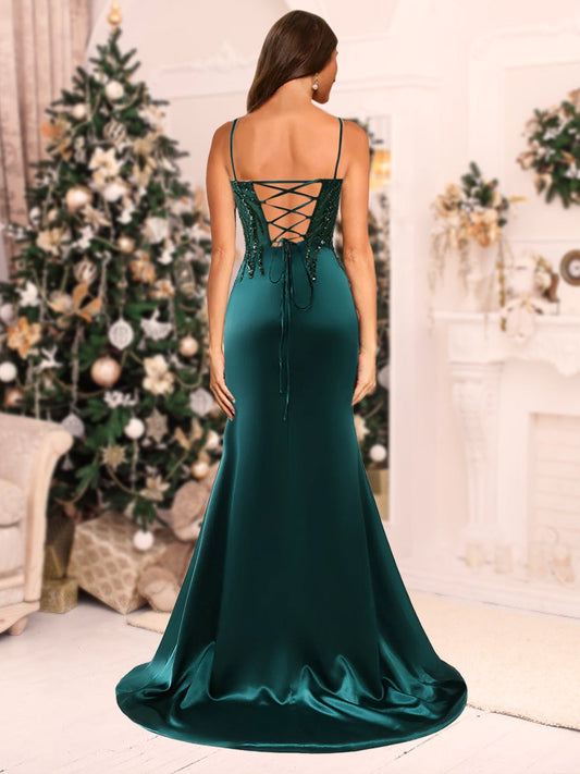 Sparkly Trumpet/Mermaid Spaghetti Straps Long Christmas Dresses with Side Slit & Appliques