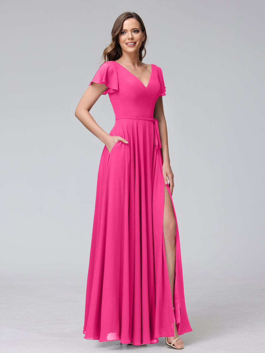 #Aaliyah 9816217 A-Line V-Neck Ruffles Short Sleeves Long Chiffon Dresses With Split Side & Pockets
