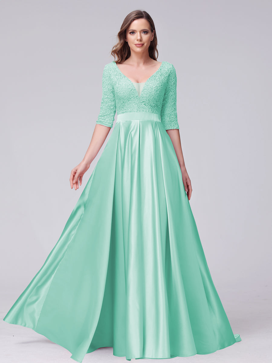 #Naomi 9816224 A-Line V-Neck Half Sleeves Applique Long Satin Bridesmaid Dresses With Split Side Pockets