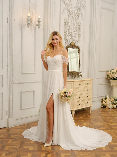A-Line/Princess Off-the-Shoulder Long Wedding Dresses with Appliques & Split Side