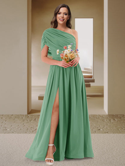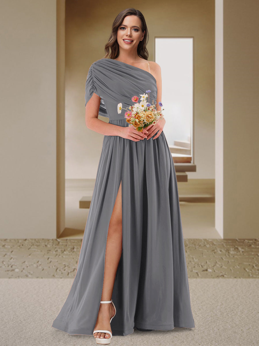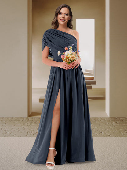 #Mikayla 11010049 A-Line/Princess One-Shoulder Ruched Satin Bridesmaid Dresses with Side Slit