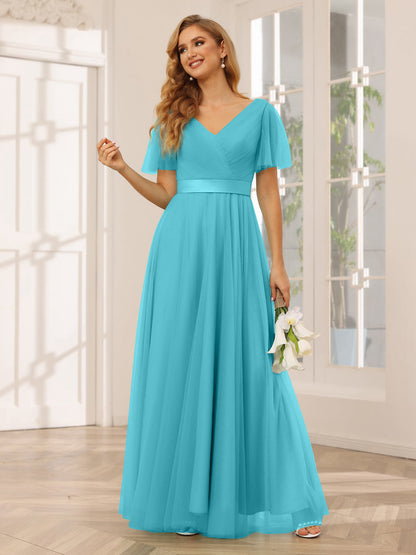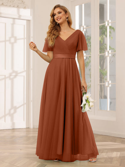 #Jane 9901279 A-Line/Princess Tulle Long Bridesmaid Dresses with Sleeves