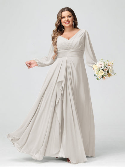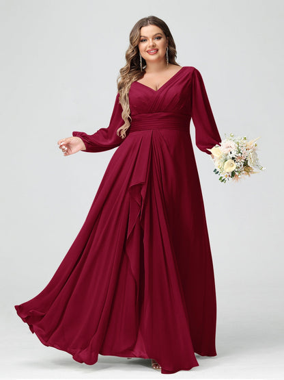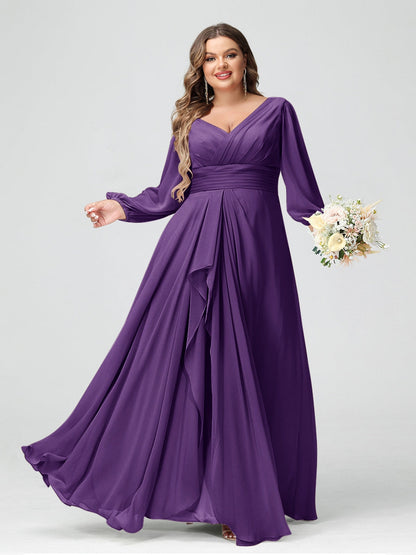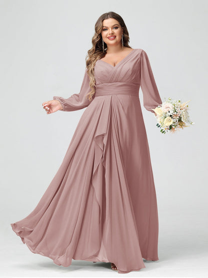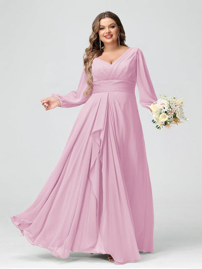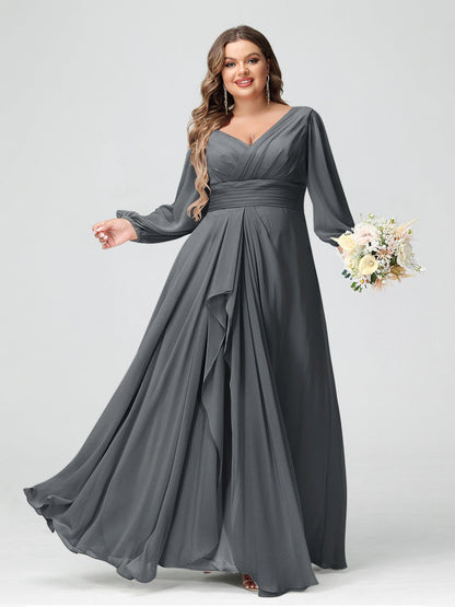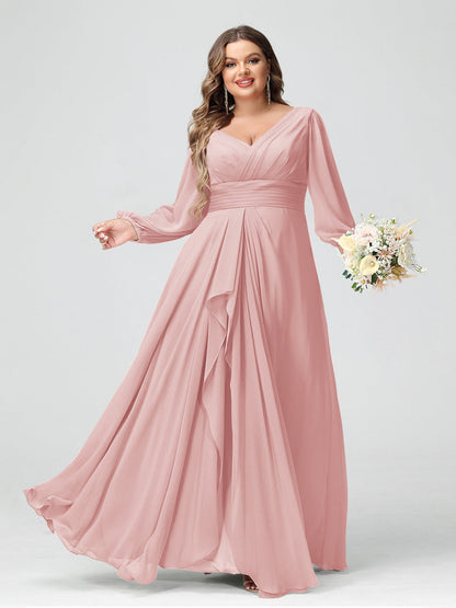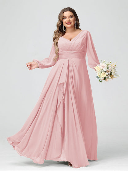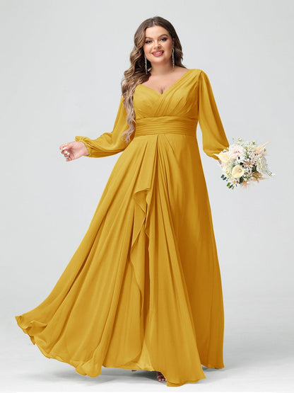 #Evelynn A9658005 A-Line/Princess V-Neck Long Sleeeves Chiffon Ruffles Plus Size Bridesmaid Dresses with Pockets