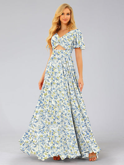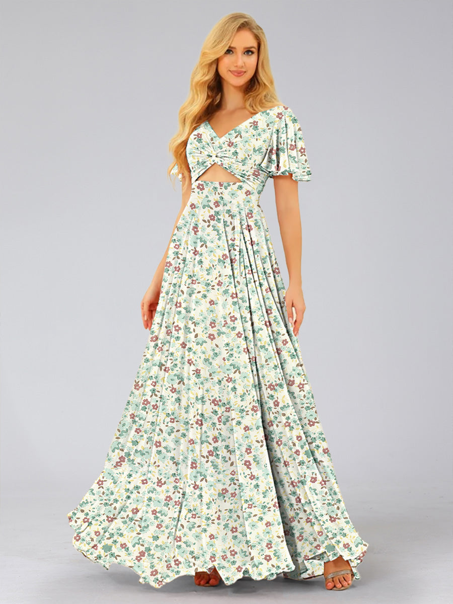#Detect 99091026 A-Line/Princess V-Neck Short Sleeves Ruched Floral Bridesmaid Dresses