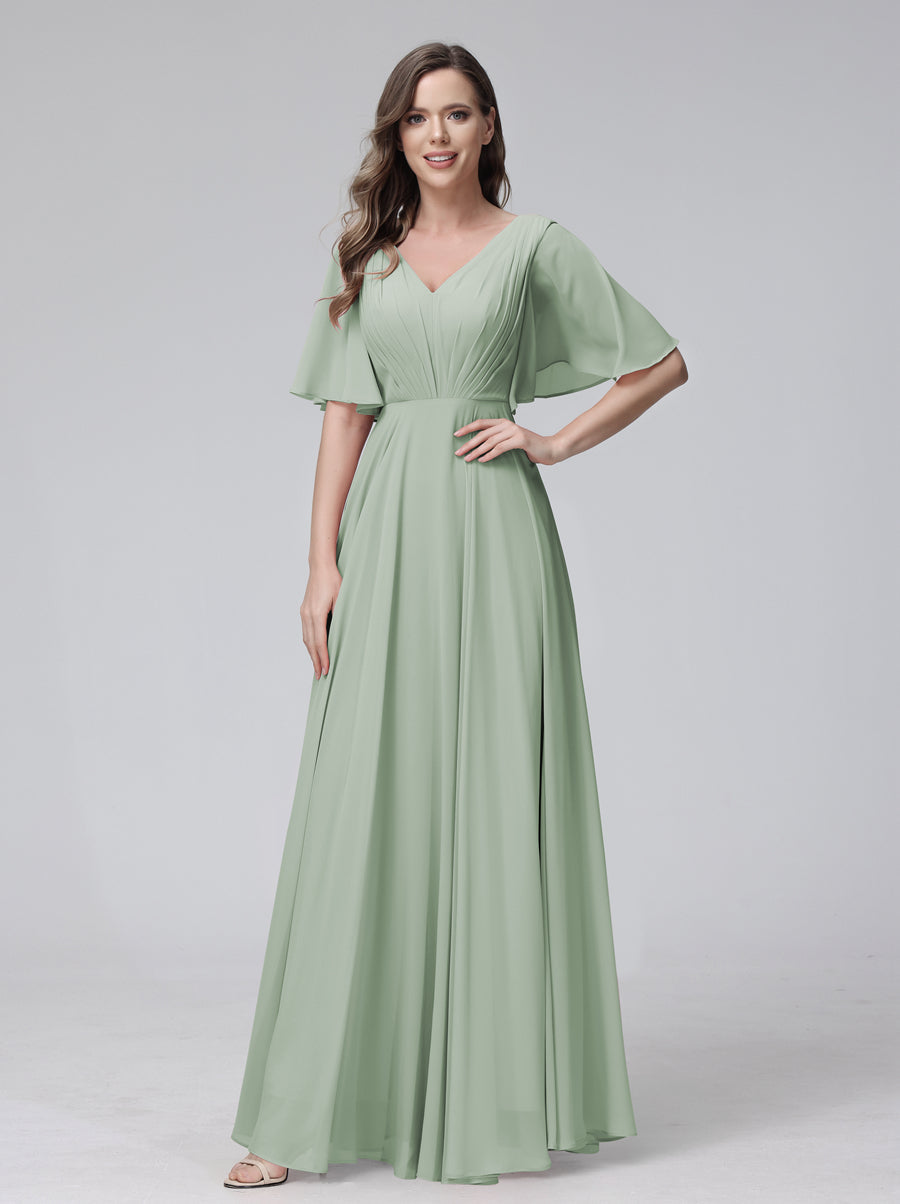 #Delilah 9816220 A-Line V-Neck Half Sleeves Long Chiffon Bridesmaid Dresses With Ruffles Pockets