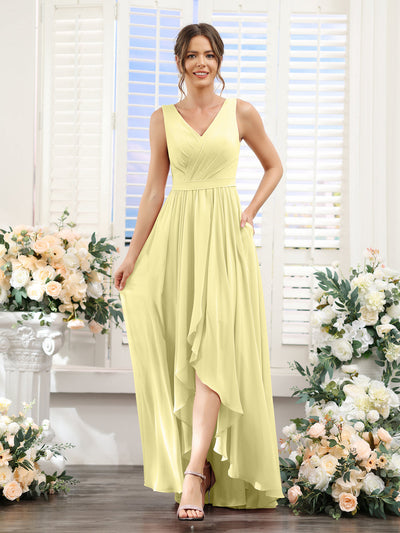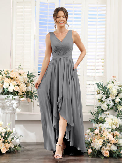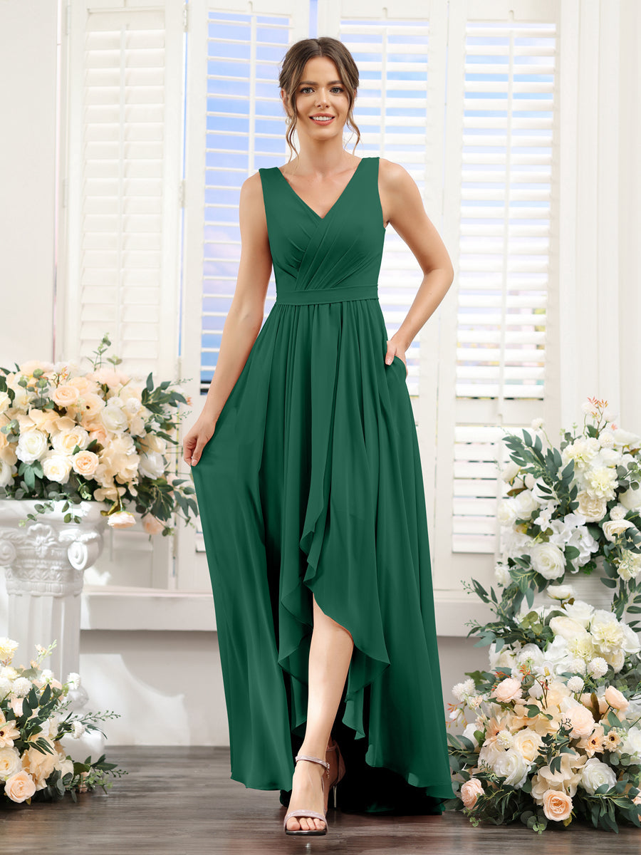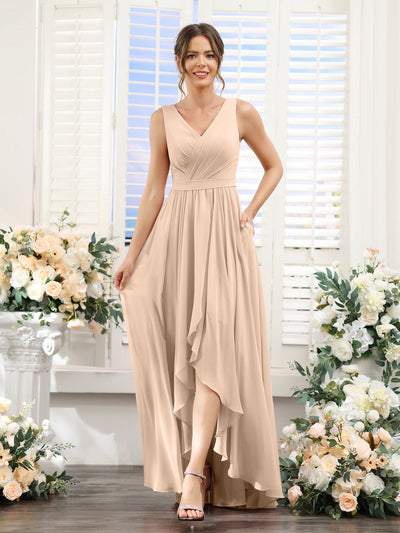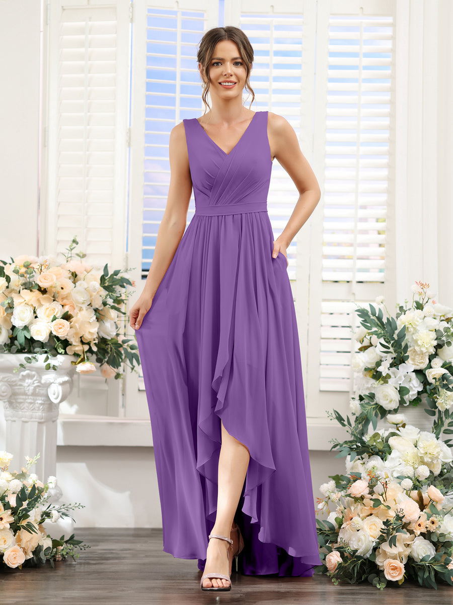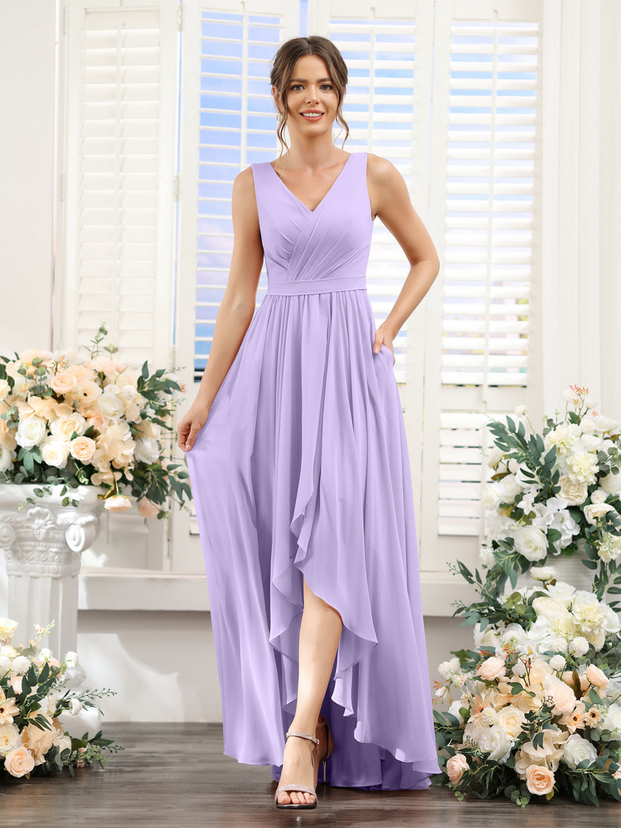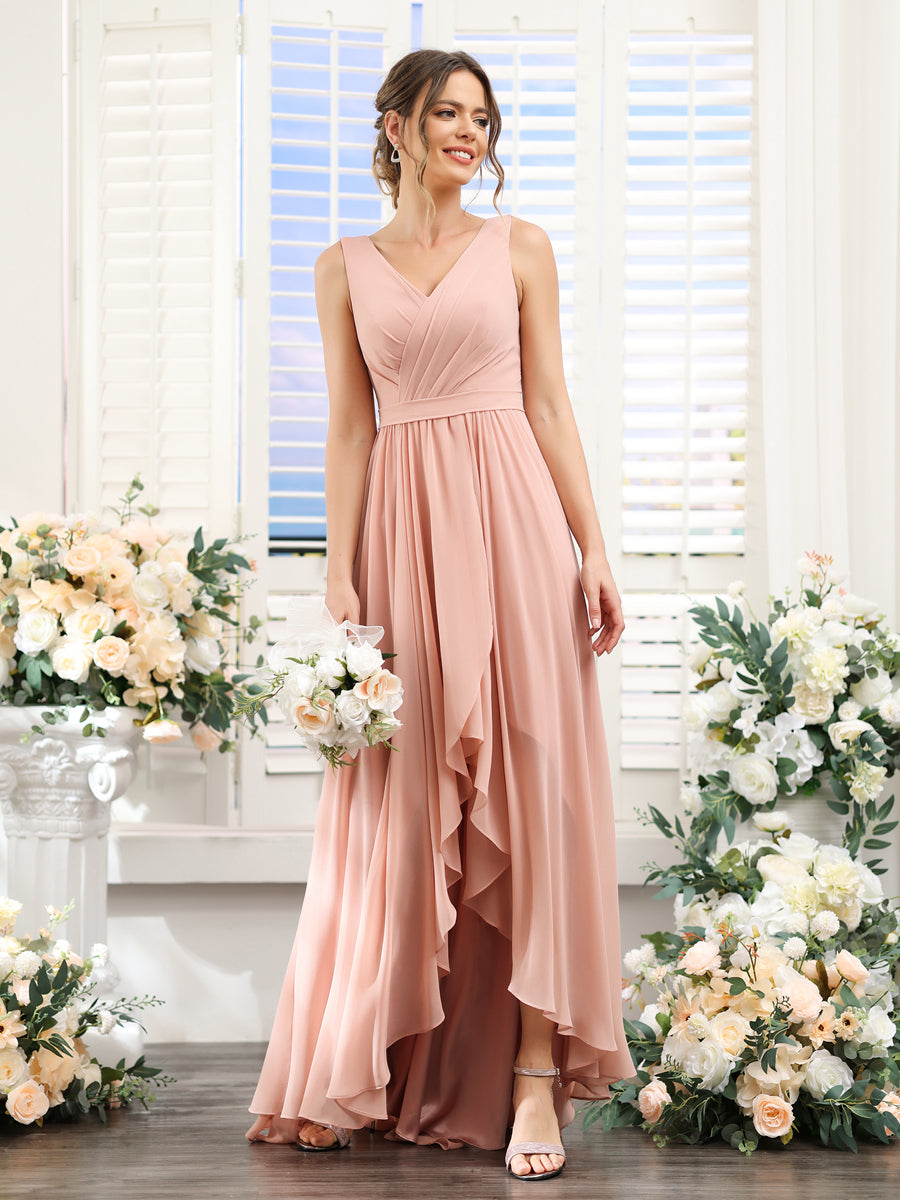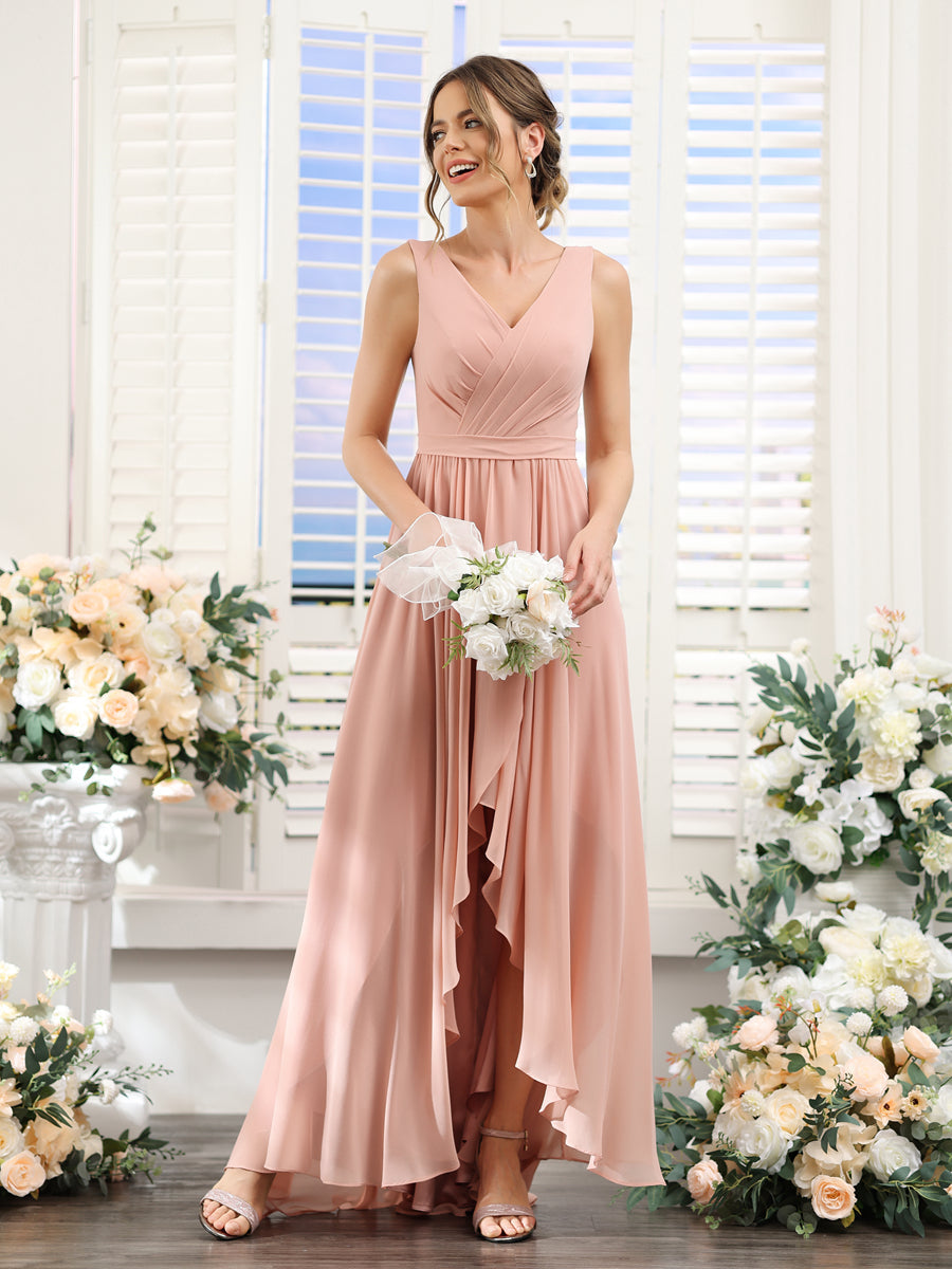 #Penelope 9627023 A-Line V-Neck Sleeveless Ruched Asymmetrical Chiffon Bridesmaid Dresses
