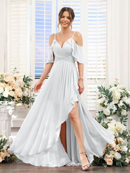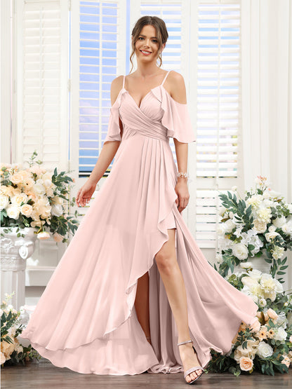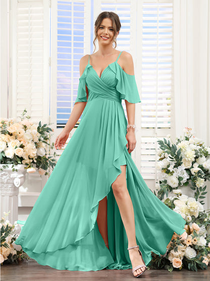 #Layla 9627021 A-Line V-Neck Spaghetti Straps Short Sleeves Asymmetrical Chiffon Bridesmaid Dresses