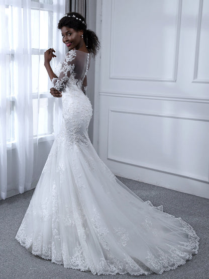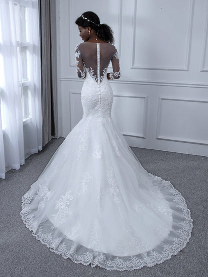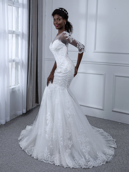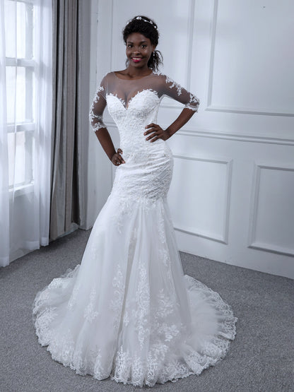 #Isla 9880105 Sheer Neck 3/4 Sleeves Tulle Mermaid Wedding Dresses with Beading Appliques