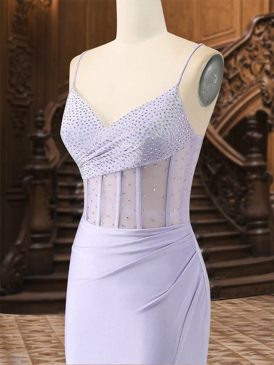 Trumpet/Mermaid Spaghetti Straps Pleated Satin Long Prom Dresses with Side Slit & Rhinestone