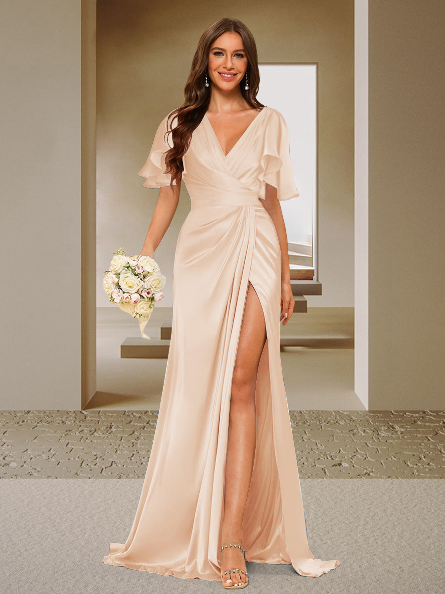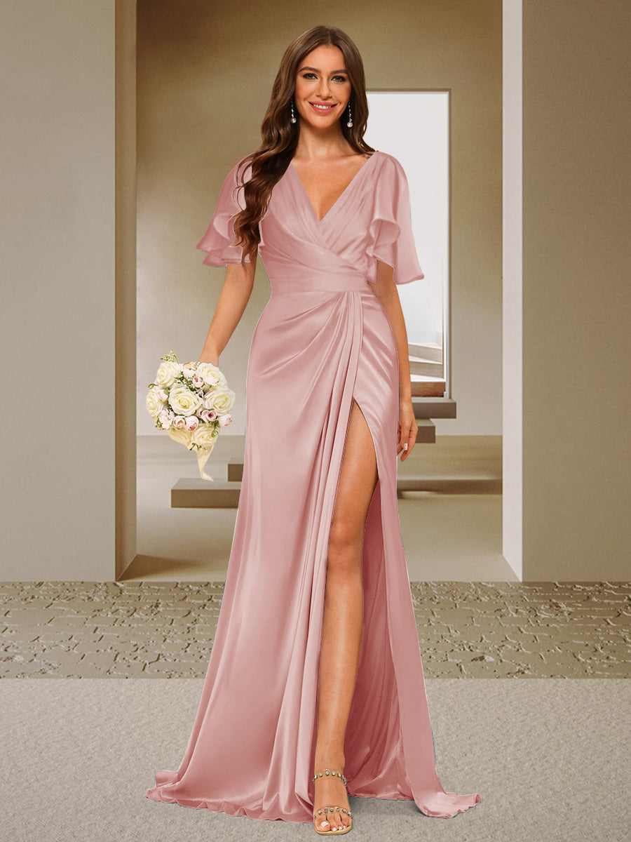 #Susanna 11010046 Trumpet/Mermaid V-Neck Short Sleeves Ruched Bridesmaid Dresses with Split Side & Ruffles