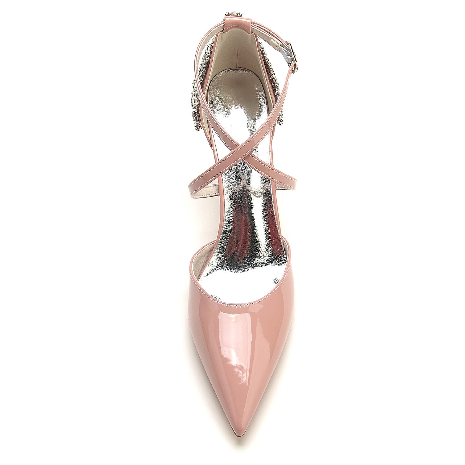 Women's Patent Leather Mirror Finish Ankle Strap Rhinestone Closed Toe Stiletto Heel Wedding Shoes
