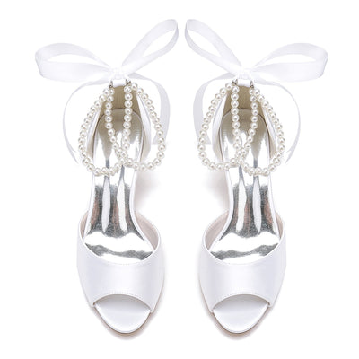 Women's Silk Satin With Ankle Strap Lace-up Pearl Peep Toe Spool Heel Party Shoes