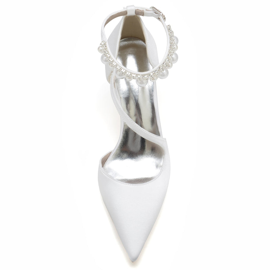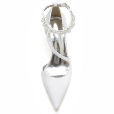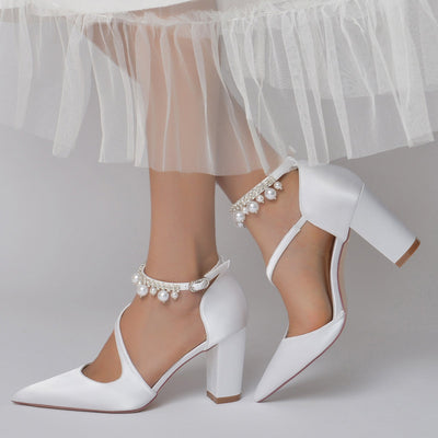 Women's Silk Satin With Ankle Strap Pearl Tassel Closed Toe Chunky Heel Party Shoes